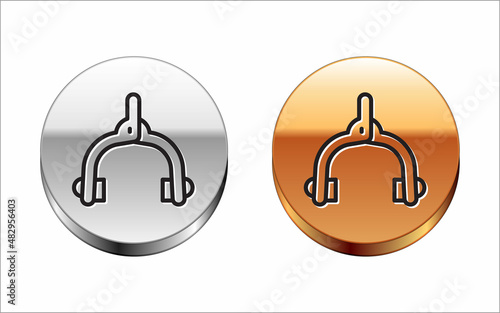Obraz premium Black line Bicycle brake calipers dual pivot icon isolated on white background. Bicycle brake wire. Silver-gold circle button. Vector