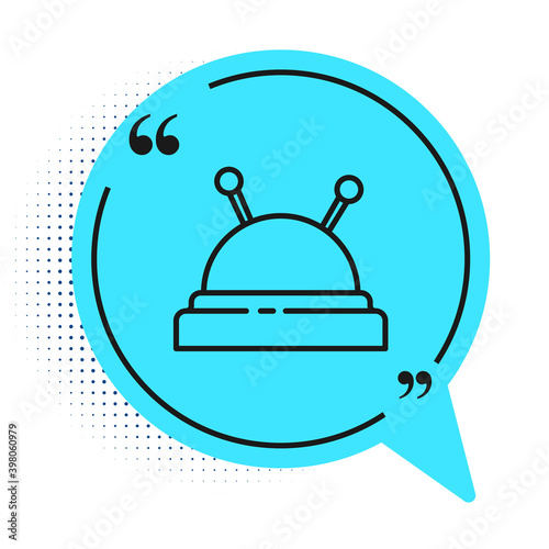 Obraz premium Black line Needle bed and needles icon isolated on white background. Handmade and sewing theme. Blue speech bubble symbol. Vector Illustration.