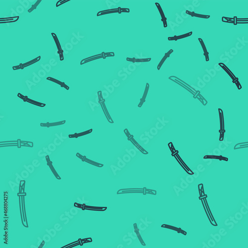 © vector_v, Fototapeta premium Black line Traditional Japanese katana icon isolated seamless pattern on green background. Japanese sword. Vector
