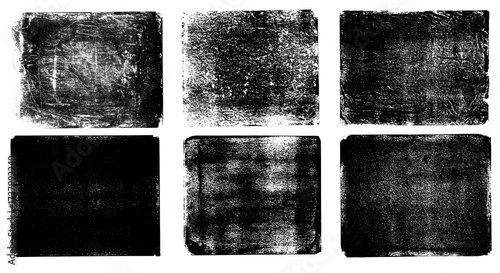 © AbdulBasit, Fototapeta premium Black linocut stamp textures on an acid white background. Handmade ink roller set with rough edges and aged effects, creating grunge urban backdrops and distressed street art overlays.