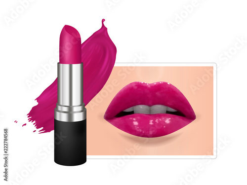 © Tatsiana, Obraz premium Black lipstick tube with silver elements, plum color lipstick, lipstick smear and lips. Vector realistic illustration isolated on white background. Good for advertising banners, promoting of makeup.