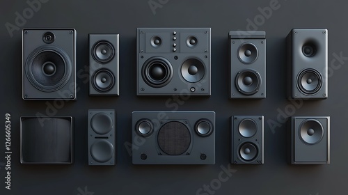 © Engineer Jahid, Obraz premium Black loudspeakers on a black background.