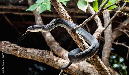 © Darcos, Fototapeta premium Black mamba black background from branch down