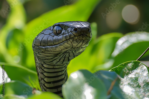 © pavlofox, Fototapeta premium Black mamba coiled in green leaves