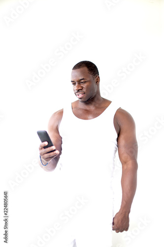 Fototapeta premium Black man is standing closed to white wall with mobile phone