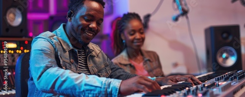 © Dalibor, Obraz premium Black man playing synthesizer in studio, creating music with focus and passion. Free copy space for text.