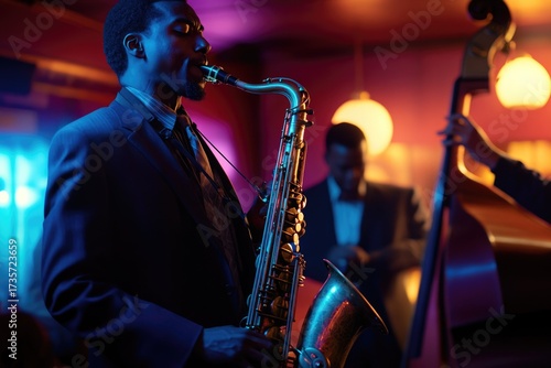 Fototapeta premium Black man plays saxophone in a dimly lit jazz club. Vibrant blue, purple lights illuminate his soulful performance and the band.