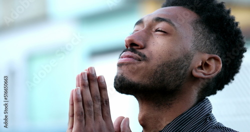 © Marco, Fototapeta premium Black man standing outside in praying hands with HOPE and FAITH