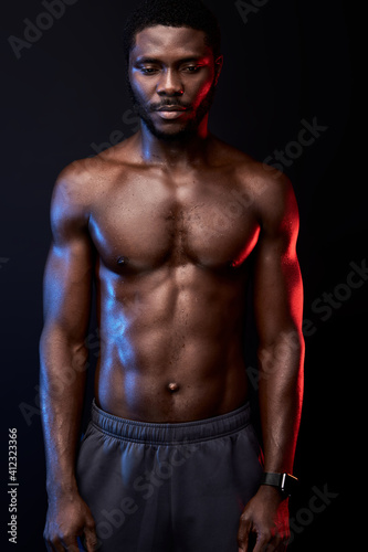 © Roman, Fototapeta premium black man with naked torso posing at camera while posing shirtless isolated in studio on black background, he is looking down. sport, workout, bodybuilding concept