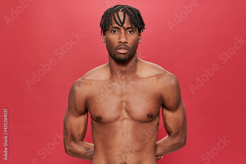 © luisrojasstock, Fototapeta premium Black man without shirt on red background