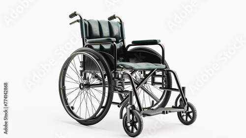 © Nano Photos, Fototapeta premium Black manual wheelchair with footrest on a white background, symbolizing accessibility and mobility assistance.