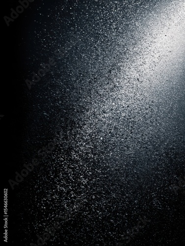 © Johannes, Obraz premium Black matte textured background with floating dust particles illuminated by soft light in the top right corner, creating a deep contrast between black and white. This abstract design emphasizes textu