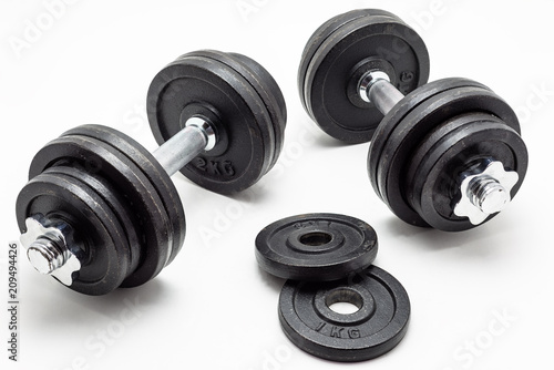 © Michal, Naklejka premium Black metal dumbbells on white background.
