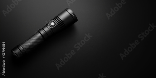 © Andres Mejia, Fototapeta premium Black metal flashlight lying on dark background