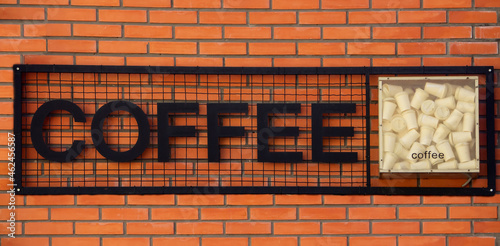 Obraz premium Black metal sign "Coffee" on a brick wall.