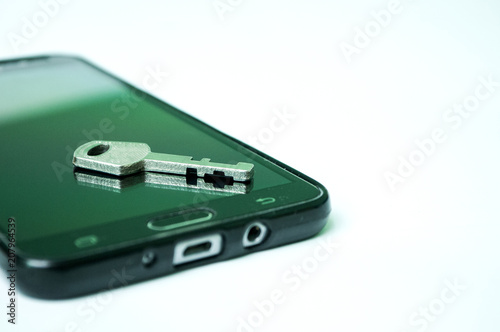 © mr2853, Fototapeta premium Black mobile phone with padlock and key isolated on white background