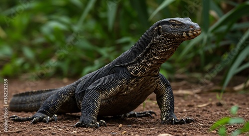 © NguyenHaiPhuong, Obraz premium Black monitor lizard alert posture earthy tones. AI Generated