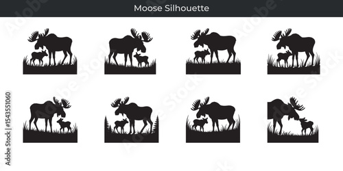 Obraz premium Black moose silhouette showing a parent and calf standing in a natural environment