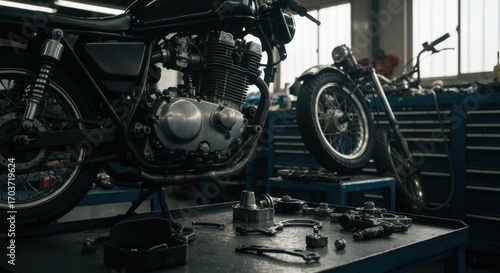 Fototapeta premium Black motorcycle in a workshop. Parts and tools laid out on a workbench