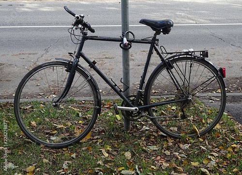 © Samir, Fototapeta premium Black Mountain City Multi Speed Road Bike Cycle Bicycle With Anti Theft Lock Parked On The Green Grass With Leafs Behind Asphalt