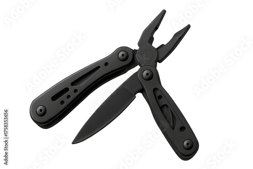 © Boris, Obraz premium Black multitool pliers with knife open on transparent background