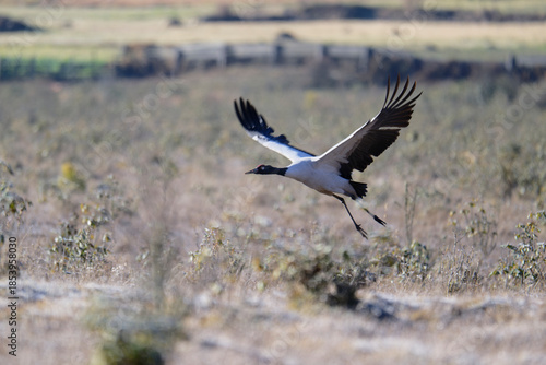 © Bhutan Japan Nature, Naklejka premium Black-necked Crane Against the Sky in Phobjikha Valley