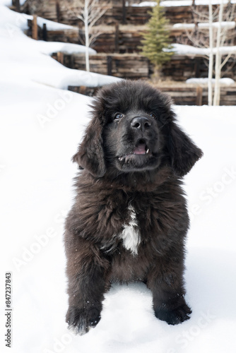 © KAT, Fototapeta premium BLack newfoundland puppy barking with snow in the background