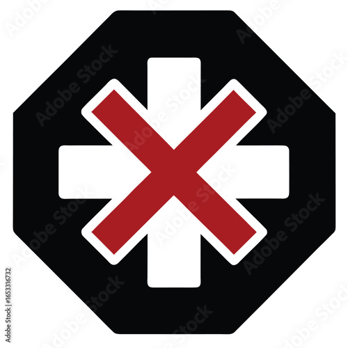 © myselfhafij, Obraz premium Black octagon with white cross and red border symbol