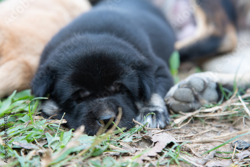 © PhotoJuthamat, Obraz premium Black of Puppy Dog sleeping on a green grass outdoors