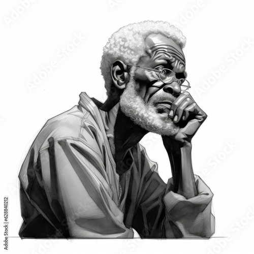 Fototapeta premium Black old man in thinking and doubts monochrome illustration. Male character with dreamy face on abstract background. Ai generated black and white sketch poster.