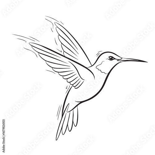 Fototapeta premium Black Outline Drawing of a Hummingbird in Flight with Detailed Wings on White...