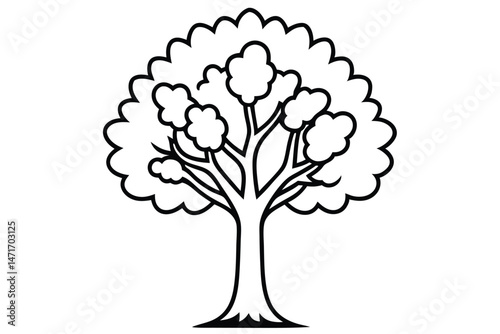© kanchanrani, Obraz premium Black outline of a rounded tree with leaves and branches on white shows silhouette