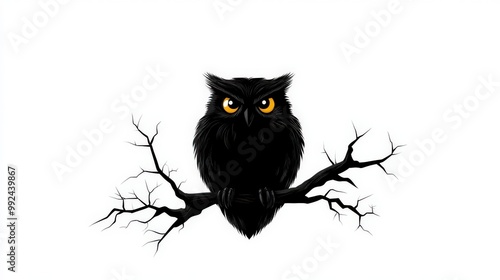 Fototapeta premium Black owl perched on a bare branch, isolated on a white background.