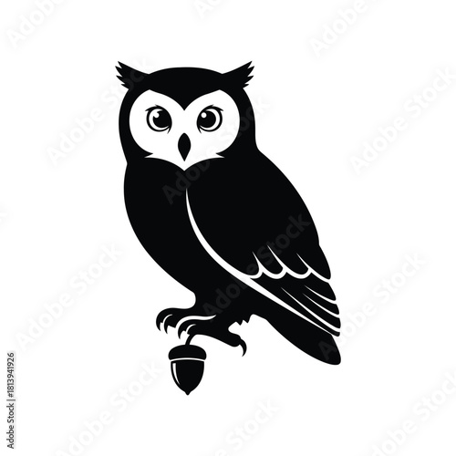 © azad, Naklejka premium Black owl silhouette holding acorn wisdom symbol vector illustration isolated on white background