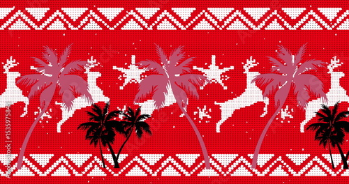 Obraz premium Black palm silhouettes contrasting in red abstract textile pattern, reindeer and star motifs