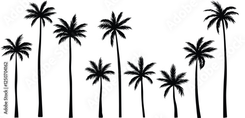 Obraz premium Black palm tree set vector illustration isolated on white background silhouette art black white stock illustration logo icon png. tropical, beach, landscape, pattern, paradise, coconut background