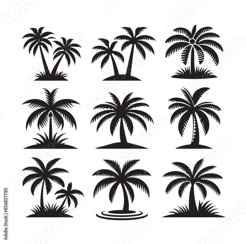 © MSTMIM, Fototapeta premium Black palm trees set isolated on white background. Palm silhouettes. Design of palm trees for posters, banners and promotional items. Vector illustration
