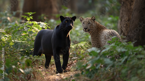 Fototapeta premium Black Panther and Leopard in Lush Green Forest Sunlight