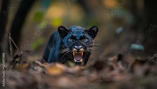 © Selvi, Fototapeta premium Black Panther's Furious Roar: Wildcat's Aggressive Display in Forest Habitat, Showing Fangs and Claws