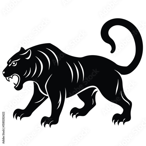 © AsifImtiaj, Obraz premium Black Panther Silhouette With Curved Tail and Open Mouth Growling on White