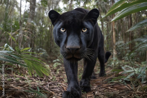 Fototapeta premium Black panther stalking through dense jungle with intense gaze