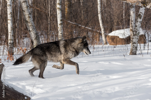Naklejka premium Black Phase Grey Wolf (Canis lupus) Jumps to the Right