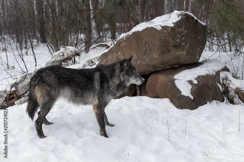 Naklejka premium Black Phase Grey Wolf (Canis lupus) Stands in Front of Rock Den