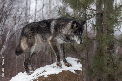 Obraz premium Black Phase Grey Wolf (Canis lupus) Stands on Rock