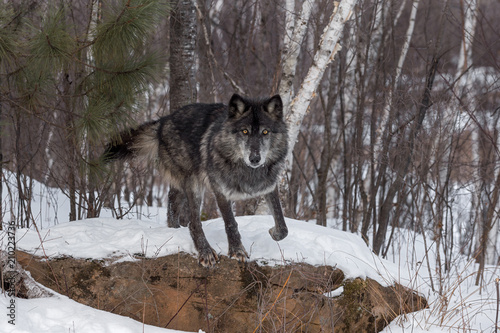 Naklejka premium Black Phase Grey Wolf (Canis lupus) Starts to Jump Off Rock