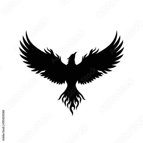 © Pecel, Obraz premium Black Phoenix Silhouette with Fiery Tail and Wings Spread Wide