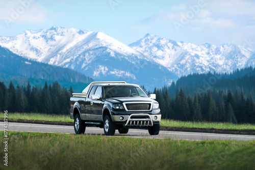 © AlexGo, Fototapeta premium Black pickup truck driving on open highway