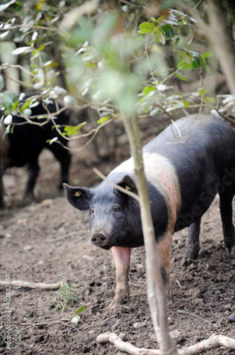 © FV Photography, Fototapeta premium black pig called Cinta Senese typical of Tuscany area and surroundings of Siena who lives free in nature on the edge of the forest