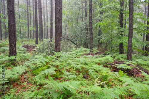 © fotocof, Fototapeta premium Black pine forest in the rain