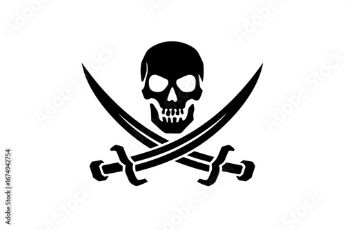 Obraz premium Black pirate skull with crossed swords, a classic Jolly Roger symbol. Isolated vector graphic icon for maritime and adventure themes